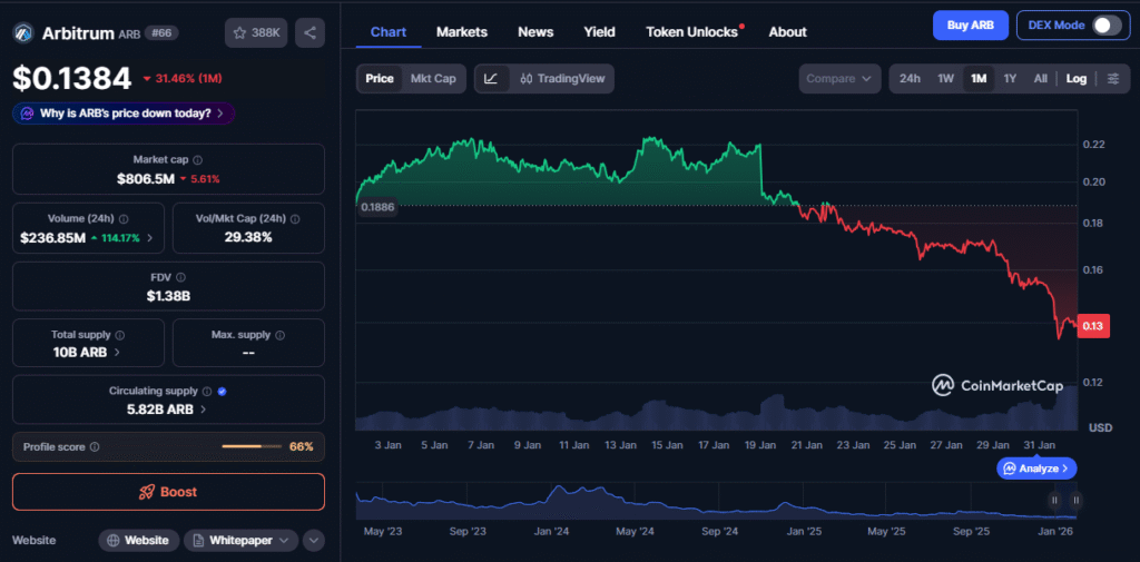 As of early February, Arbitrum (ARB) is under heavy selling pressure.
