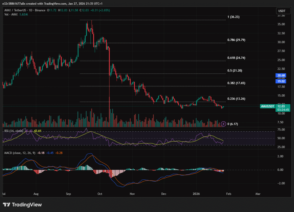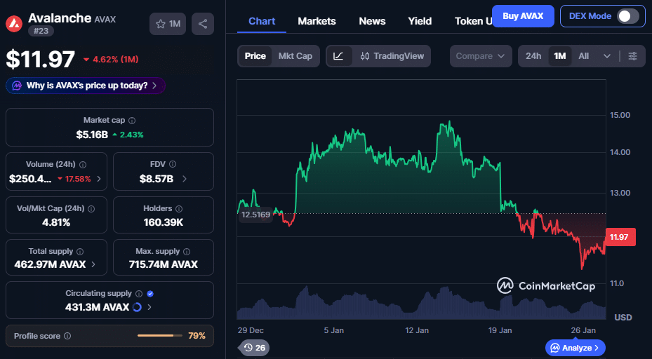 As of late January, Avalanche is in the middle of a complex market. The token currently trades around $11.75, especially with the high volatility from the launch of the first spot Avalanche ETF by VanEck.