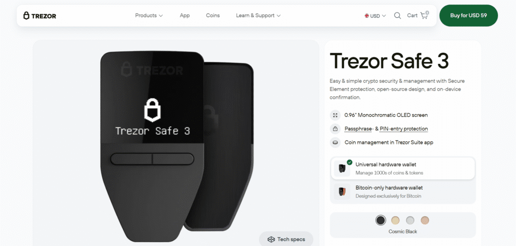 • Key features & security: secure element chip, PIN protection, firmware updates, multi-asset.