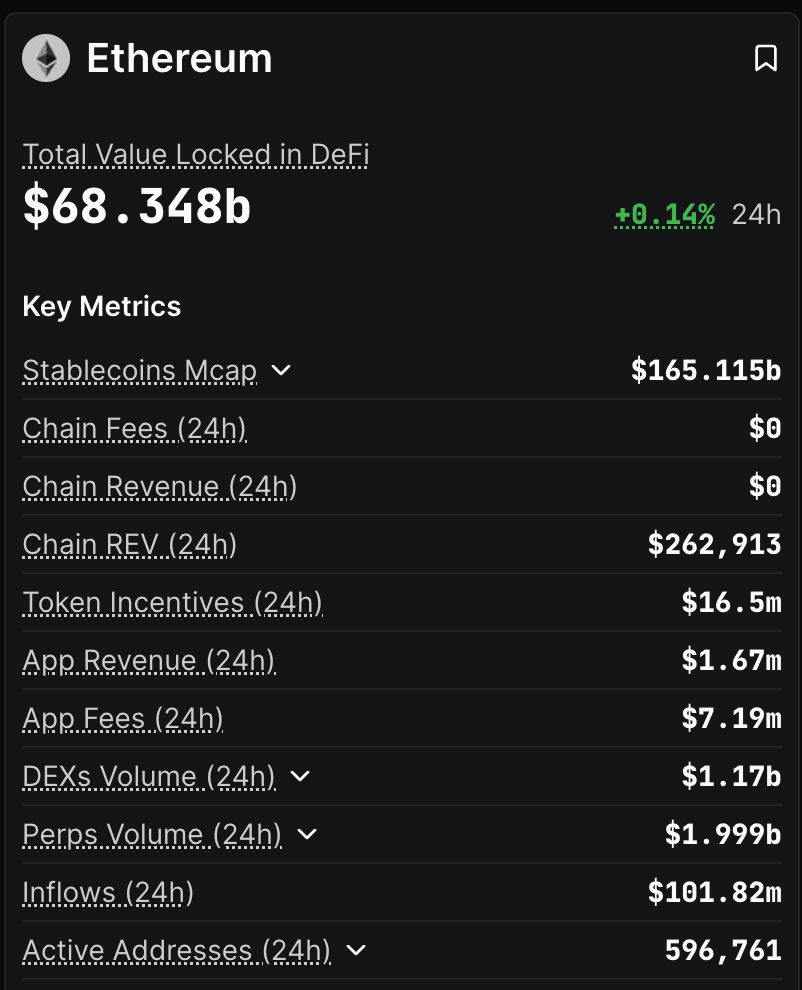 Ethereum Key Metrics from DeFi Llama