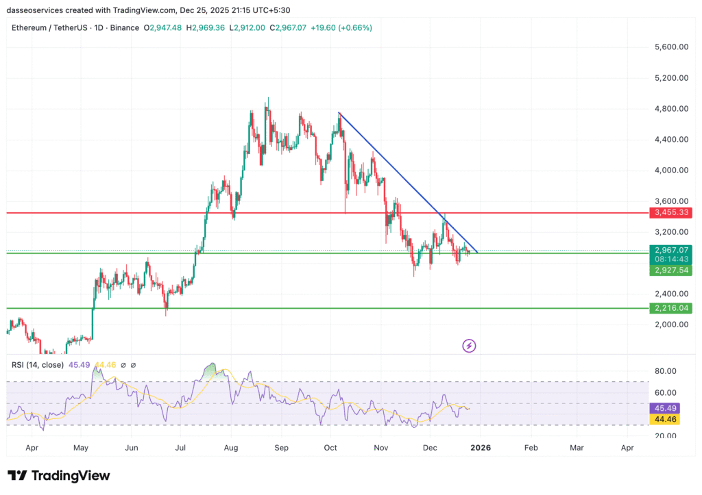 Ethereum has seen a sharp fall from $4900 levels since August 2025, when it attained an ATH of $4953. Further, the fall was intensified during the October 2025 market correction, when it fell to the $2,967 support level.