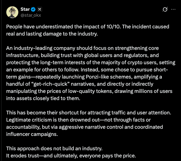 However, market participants allege that it was Binance that caused the October 10 market crash. OKX crypto exchange CEO Star Xu alleged that Binance’s offering of high-risk products like Ethena’s USDe attracted investors with its 20% yield, with some users even reportedly reinvested the same multiple times through LP staking and yielded upto 40% in staking.