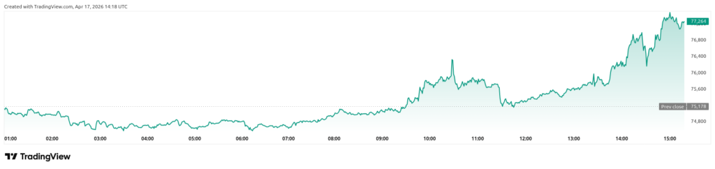 As per today’s information provided through TradingView and CoinMarketCap websites, BTC price is currently approaching the $76,000 level as the resistance point. The rally, which led to the new all-time high price of over $75,577, was caused by the decreasing tensions between the USA and Iran, and the possible declaration of a ceasefire. With markets returning to normal, the Saylor Strategy of debt and equity to acquire a capped-supply digital asset showed its strength again.
