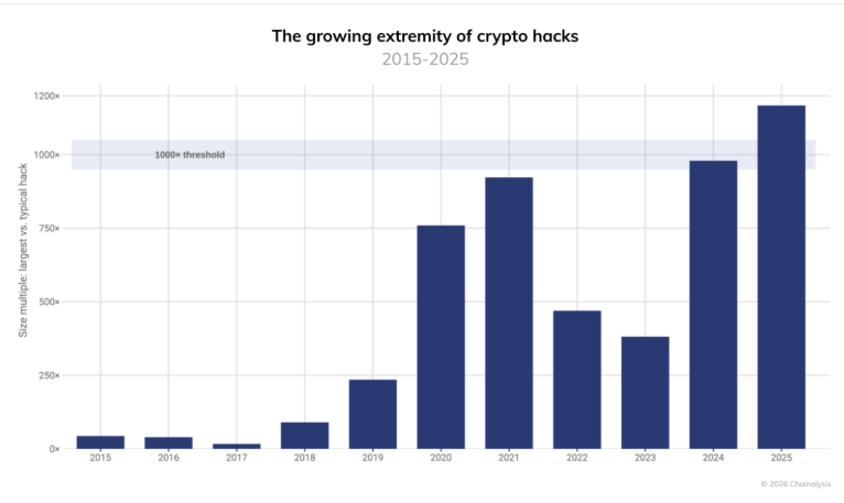 Chainalysis also notes that only three attacks caused 69% of all service losses. This concentration shows how single breaches now define yearly outcomes. In all, smaller incidents still happen but they barely move totals.