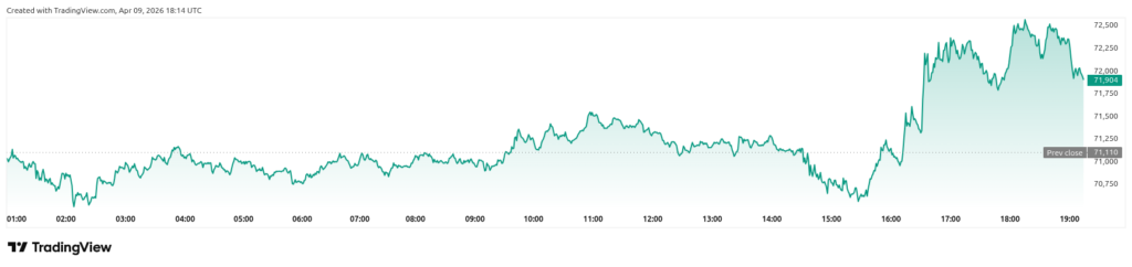 As of the time of the article’s release, Bitcoin was at about $71,400, according to the data provided by CoinMarketCap and TradingView. After a short decline to $69,800 as the news went round, the price recovered to $72,700 in 24 hours.