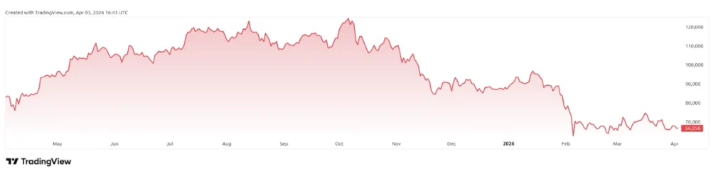 This forecast is made when the cryptocurrency market is undergoing a major change. Bitcoin entered a distribution stage after hitting a historic high of $126,080 on October 6, 2025. By early April 2026, the prices have settled in the range of $66,000-$68,000. The BTC/USD 1-year chart is shown in the table below: