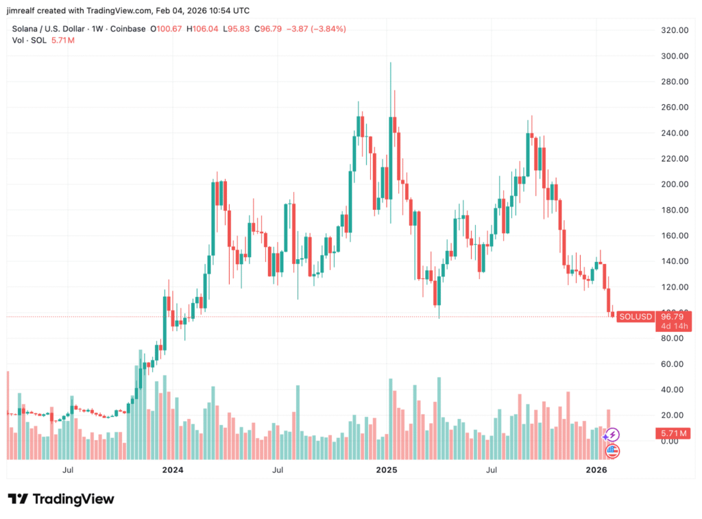 By 4 February 2026, Solana price had dropped below $100 and touched levels near $96–98, marking a decline of almost 35% from its January highs. Over the last week, losses have run into double digits, making Solana one of the weakest large‑cap assets in that period.