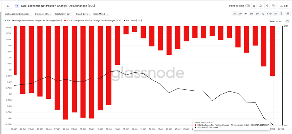 One key metric is exchange net position change. On Jan. 15, net outflows stood near 535,000 SOL. This already suggests some accumulation. When the price dropped close to $100 on Feb. 1, outflows jumped to more than 2.25 million SOL.